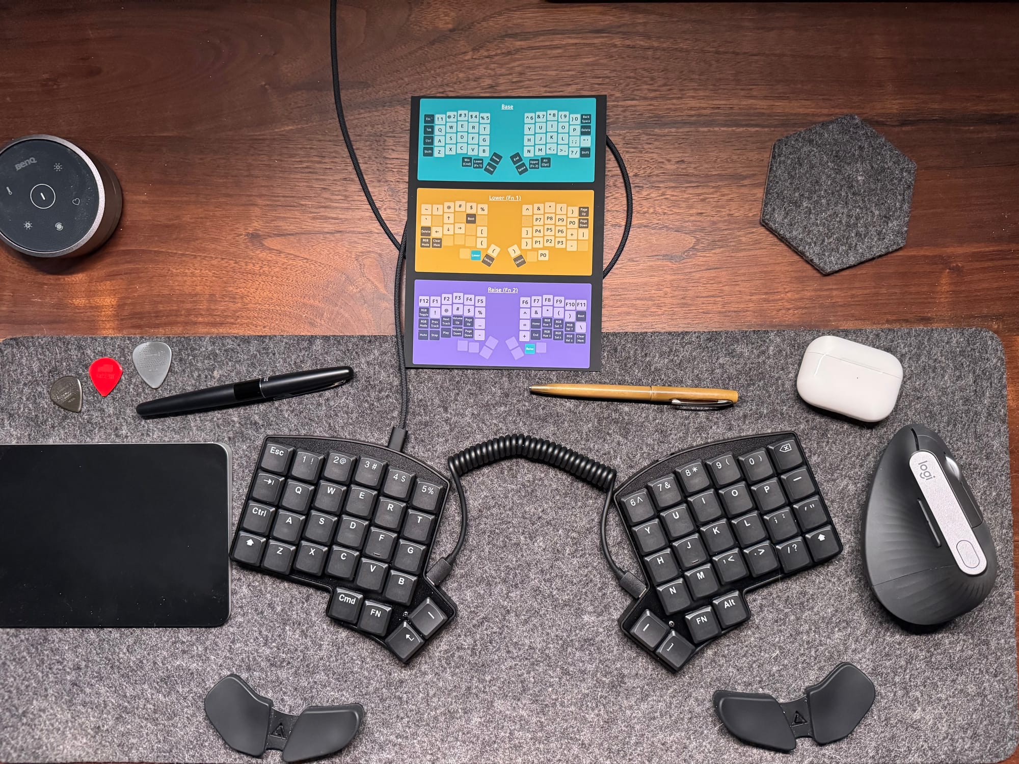 About eight months ago, I started to notice some pain in my wrists after extended typing sessions. With a family history of carpal tunnel and wrist pain and as a musician who wants to keep arthritis at bay for as long as possible, I decided to take action on my desk ergonomics. I already bought a vertical mouse in August, but I decided to take it a step further and go with a Split Columnar Staggered keyboard. Specifically, the Keeb.io Iris.